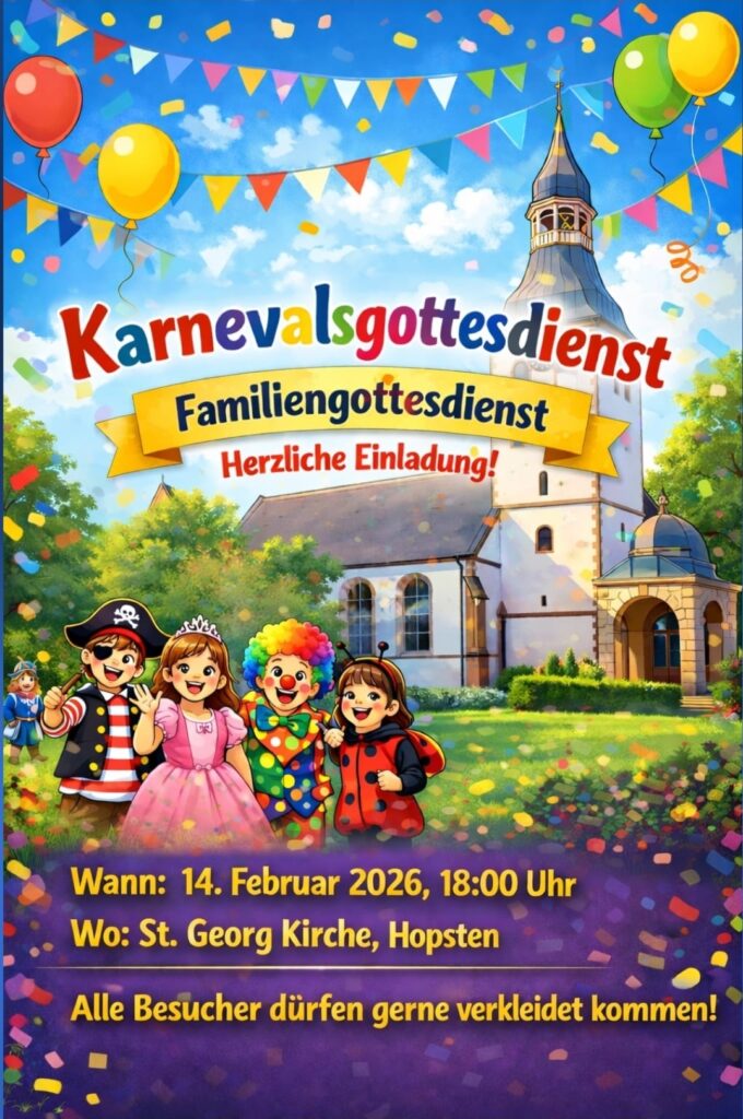 Am 14. Februar 2026 um 18:00 Uhr wird die St.-Georg-Kirche in Hopsten bunt, fröhlich und ein kleines bisschen verrückt – denn wir feiern gemeinsam einen karnevalistischen Familiengottesdienst!